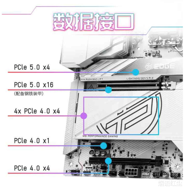 扩展能力是微星MPG Z890 EDGE TI WIFI刀锋钛主板的又一亮点,它提供了5个M.2接口,其中靠近CPU位置的M.2插槽支持PCIe 5.0×4规格,最高可支持15000 MB/s速度的固态硬盘。另外4个M.2插槽都是PCIe 4.0×4规格,还配备了4个SATA接口。
